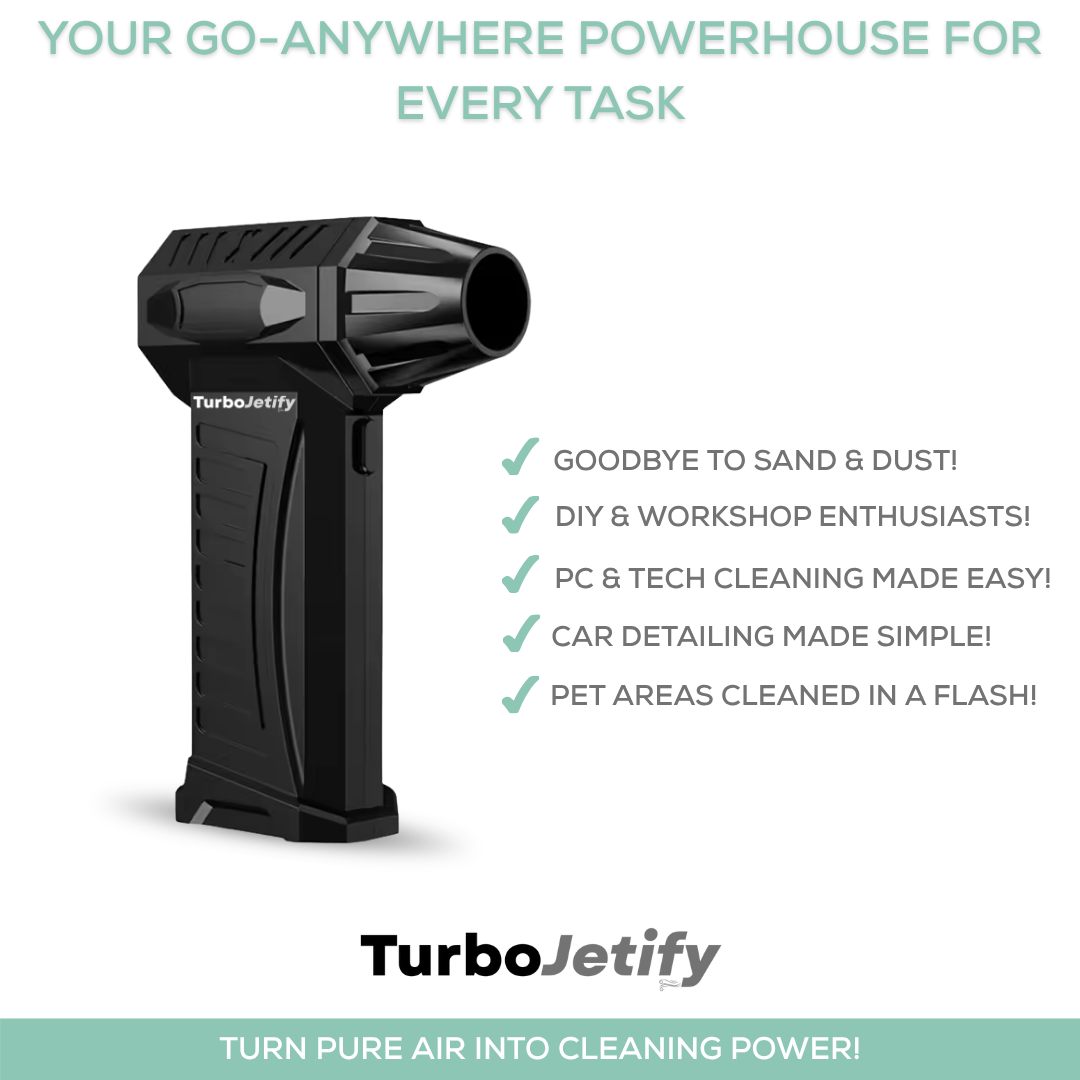 The TurboJetify Blower uses a 1,000,000 RPM brushless turbofan motor to unleash powerful air speeds of up to 58m/s. This intense airflow creates 300g of thrust, blasting away dust, sand, pet hair, and debris in seconds. Powered by a 10,000mAh dual 21700 lithium battery, it delivers up to 2 hours of use per charge. With infinite speed control, adjust airflow for anything—from delicate electronics to heavy-duty industrial cleaning. Switch between blowing or suction (with the vacuum kit) and let the Turbo Jet Blower make cleaning faster, easier, and far more effective than ordinary blowers.